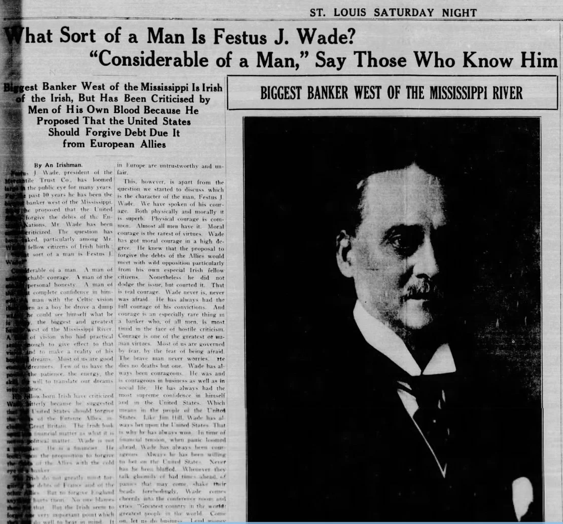 Festus J Wade, president of the Mercantile Trust Company, has loomed large in the public eye for many years. For the past 10 years, he has been the biggest banker west of the Mississippi. Since he proposed that the United States forgive the debts of the Entente nations, Mr. Wade has been much criticized. The question has been asked, particularly among Mr. Wade's fellow citizens of Irish birth: “What sort of man is Festus J Wade?